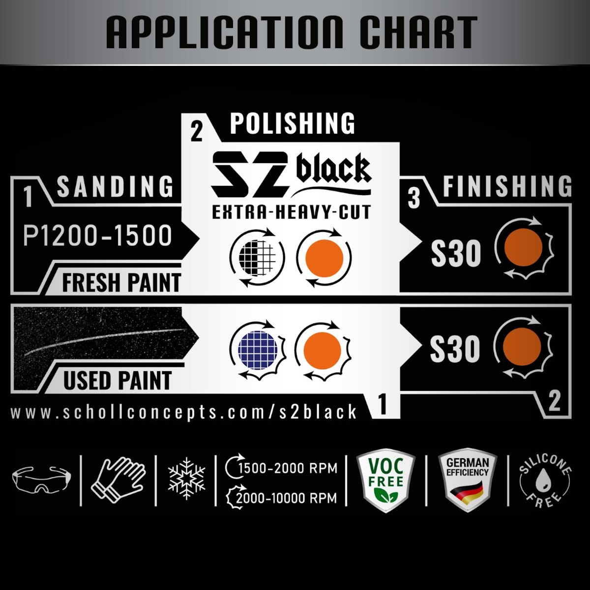 S2 BLACK – Die Hochleistungs-Schleifpaste der Extraklasse Die S2 BLACK wurde speziell für den professionellen Aufbereiter entwickelt – und begeistert ebenso den anspruchsvollen Enthusiasten. Sie ist die ultimative Lösung für die Bearbeitung gebrauchter und stark verwitterter Lacke. Dank ihrer maximalen und einzigartigen Abtragsleistung sowie den herausragenden Hochglanz-Eigenschaften lassen sich selbst tiefe Lackdefekte in kürzester Zeit beseitigen.