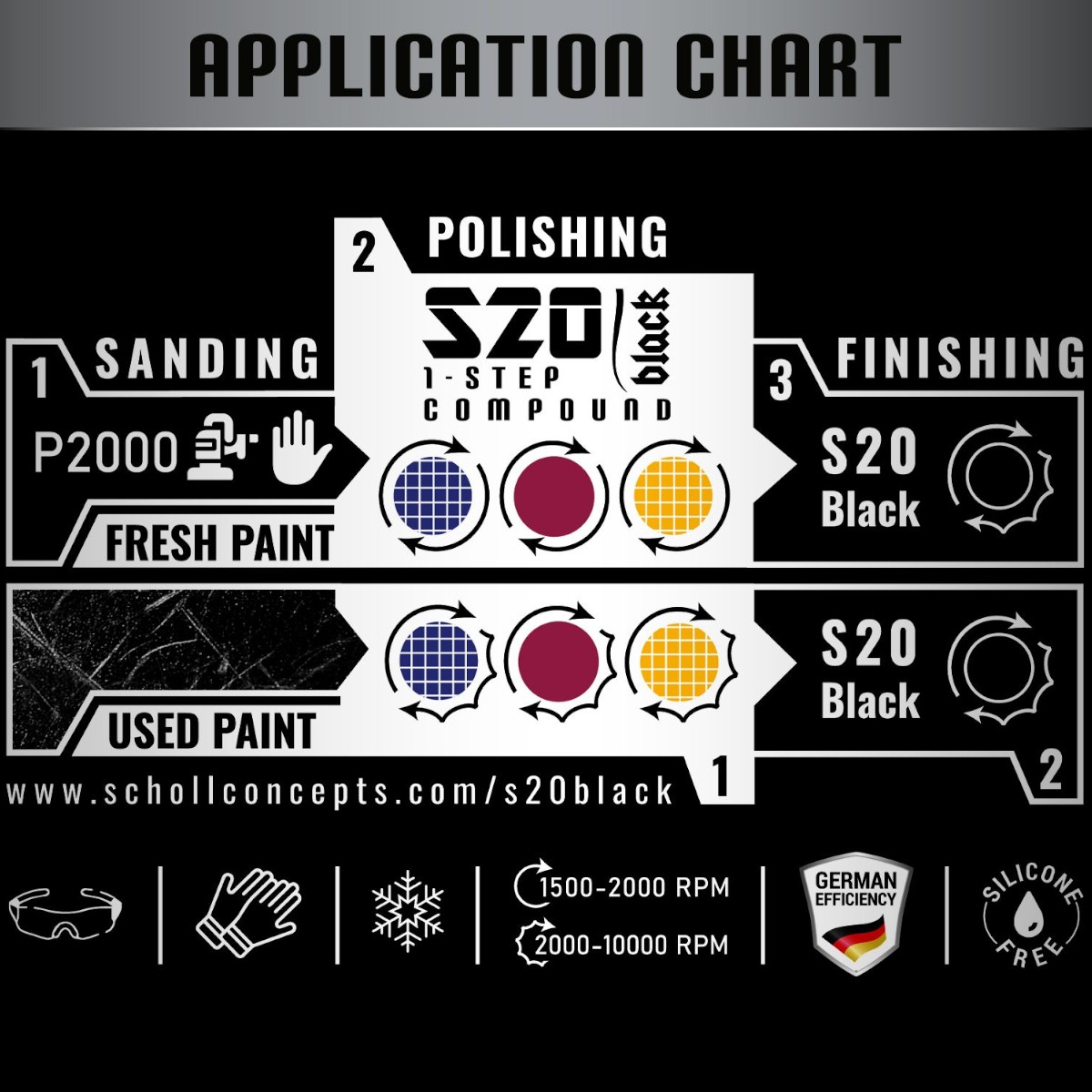 Egal ob extrem harte, kratzresistente Klarlacke oder sensible Lacksysteme: Die S20 Black meistert jede Herausforderung. Tiefe Kratzer und starke Gebrauchsspuren werden in Rekordzeit eliminiert, während das Finish selbst auf kritischen, dunklen Lacken durch absolute Brillanz überzeugt. Hologramme werden nicht nur kaschiert, sondern nachhaltig und restlos auspoliert.